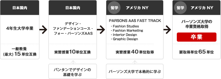 - 本コースで取得した単位をパーソンズ大学AASプログラムへ単位互換できるので、通常2年かかる留学期間を1年に短縮することが可能です。
